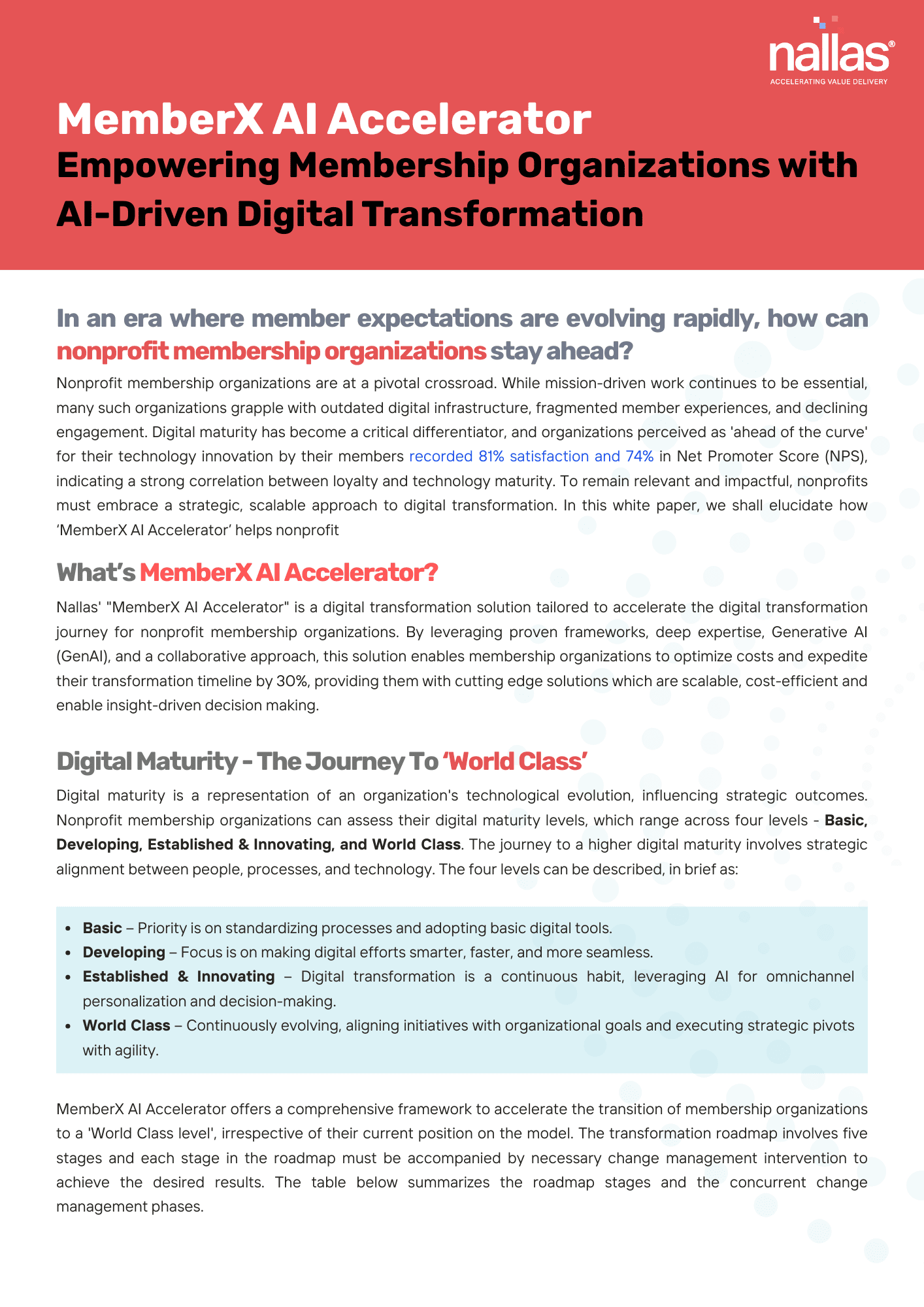 Our latest white paper unveils MemberX AI Accelerator, Nallas’ Digital Transformation framework to fast-track your organization’s transformation journey by 30%, embed GenAI from the start, and drive measurable ROI.